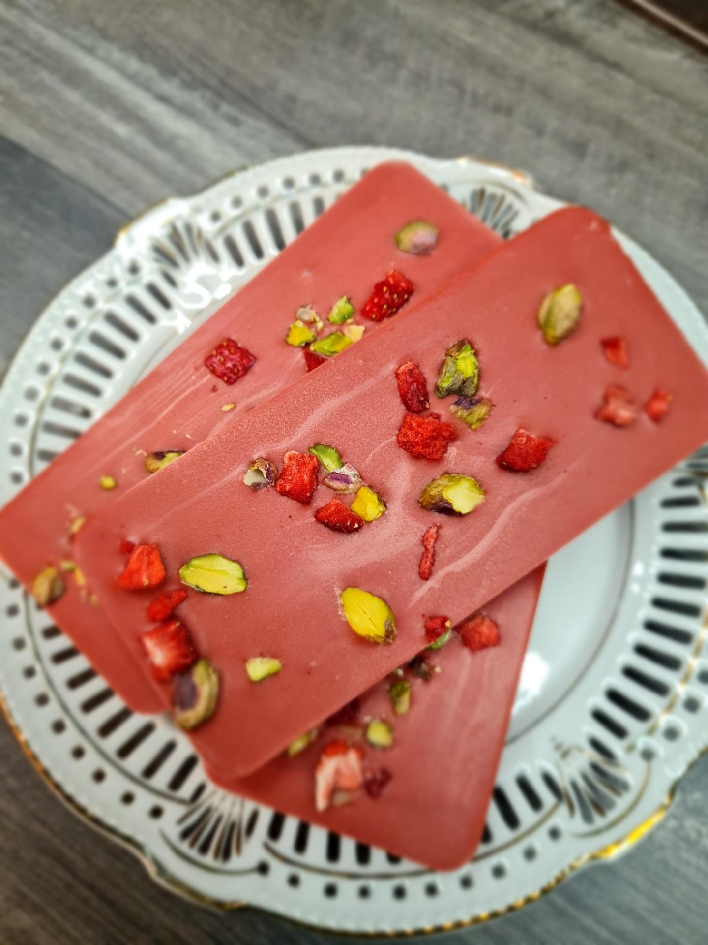 En nyhet är min rosa jordgubbskaka strösslad med hackade pistagenötter och jordgubbsbitar. Själva kakan är gjuten av Valhronas jordgubbschoklad. Den fullkomligt doftar och smakar jordgubb och sommar!